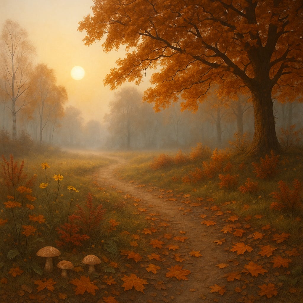 Maar buitenlanders, en schilders en wie er maar een blik voor heeft valt die uitzonderlijke schoonheid op. Populieren en berken hebben hun blad al verloren, maar de eikenbladeren laten nog een grote variatie in kleur zien. Er zijn nog volop paddenstoelen, en we worden vaak verrast door een late tweede bloei van havikskruiden, van de gaspeldoorn, en natuurlijk van het madeliefje.