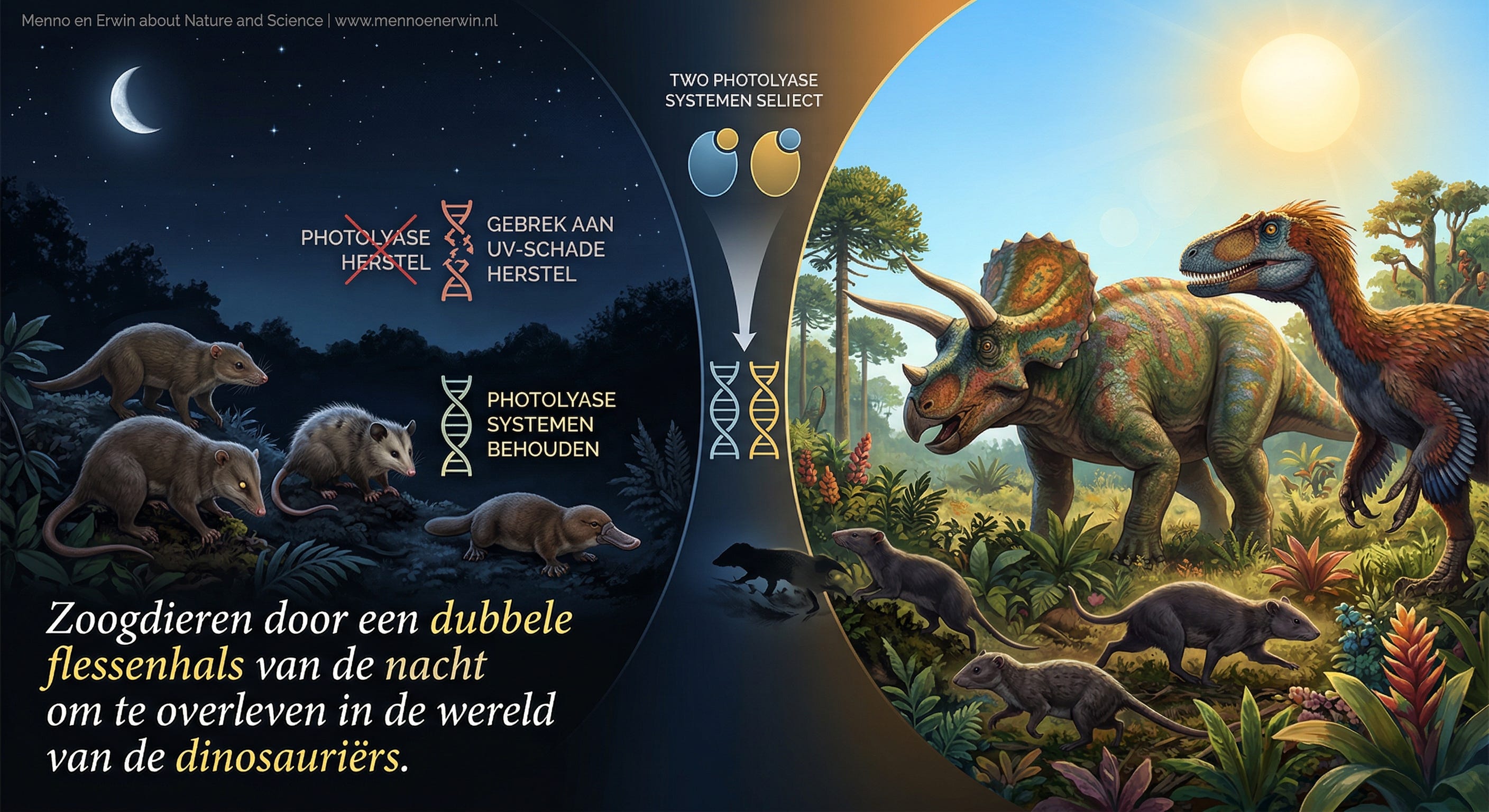 Anders dan deze placentalia beschikken buideldieren en eierleggende zoogdieren (het vogelbekdier en de mierenegel) wel over een UV-schade herstelsysteem, een zogenaamd fotolyase. Later, maar niet gepubliceerd onderzoek maakt aannemelijk dat helemaal aan het begin van de ontwikkeling van alle zoogdieren al twee andere fotolyase systemen uitgeselecteerd zijn. Dat zou suggereren dat de placentale zoogdieren door een dubbele flessenhals van de nacht gegaan zijn, om te overleven in een wereld vol dinosauriërs. Vogels worden tegenwoordig gezien als de enige overlevenden en de directe afstammelingen van de dinosauriërs. Zij behoren daarom volgens moderne indeling bij de vier nog overlevende ordes van reptielen. Die kennen wij als de groep van de slangen, hagedissen en wormhagedissen, de groepen van de schildpadden en de krokodil-achtigen en de enige (in Nieuw Zeeland) overlevende soort van de brughagedissen. Al deze reptielen hebben samen met de vogels niet alleen de drie tegen UV schade beschermende fotolyase systemen. Ook beschikken ze over een grotere variatie aan kleurdetectie, inclusief infrarood en ultraviolet.